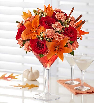 Serve up smiles with our fresh take on a popular cocktail! Rich roses, lilies, mini carnations and more are hand-arranged by our expert florists in an oversized keepsake martini glass. We’ve added sweet cinnamon sticks and crystal accents to really spice things up for birthdays, get-togethers or just because. Arrangement of roses, lilies, hypericum, mini carnations and salal, topped with cinnamon sticks Lilies may arrive in bud form and will open to full beauty over the next 2-3 days Arrives in a keepsake, food-safe, oversized acrylic martini glass filled with yellow and ruby crystal gel; glass measures 9"H Large arrangement measures approximately 17"H x 13"L Medium arrangement measures approximately 15.5"H x 11"L Small arrangement measures approximately 14.5"H x 10"L Our florists hand-design each arrangement, so colors, varieties and container may vary due to local availability