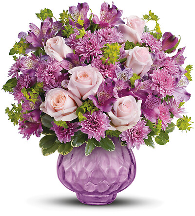 Like fine chiffon, this luxurious lavender bouquet is fabulously feminine and delightfully delicate. She'll love the beautiful blooms today, the brilliant gem votive vase tomorrow, and you - forever!